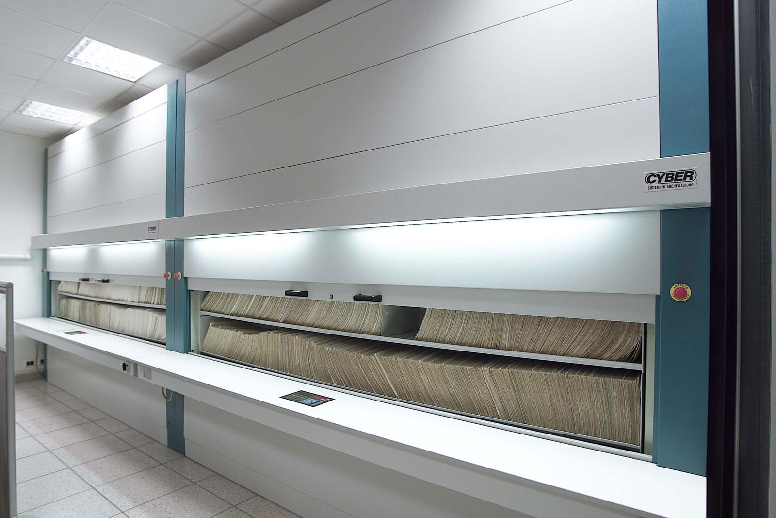 Cyber Italia ofrece una amplia gama de soluciones de vanguardia para la gestión de documentos, fármacos y materiales de varios tipos. Nuestra oferta incluye almacenes con bandejas trasladas, dispensadores automáticos, almacenes y archivos con bandejas rotativas, así como armarios móviles compactables. Nuestros sistemas se diferencian por la posibilidad de personalización e innovación: Cyber Italia no produce en serie sino según las exigencias de cada cliente. Cada solucción es diseñada para optimizar espacios, mejorar la eficencia operacional y garantizar una organización impecable, favoreciendo y promoviendo la ergonomía y un lugar de trabajo más seguro.